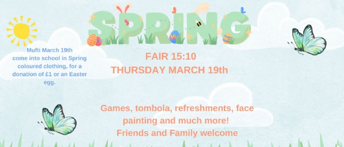 Our Spring Fair will take place on Thursday 19th March. To mark the occasion, children are invited to attend school in mufti clothes on this day. The Fair will begin immediately after school at 3:10pm, offering an afternoon full of enjoyable activities.